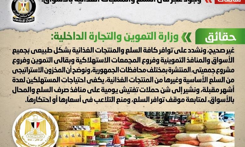 تداولت بعض المواقع الإلكترونية وصفحات التواصل الاجتماعي أنباء بشأن وجود عجز في السلع والمنتجات الغذائية بالأسواق، وقد قام المركز الإعلامي لمجلس الوزراء بالتواصل مع وزارة التموين والتجارة الداخلية، والتي نفت تلك الأنباء، مُؤكدةً أنه لا صحة لوجود عجز في السلع والمنتجات الغذائية بالأسواق، مُشددةً على توافر كافة السلع والمنتجات الغذائية بشكل طبيعي بجميع الأسواق والمنافذ التموينية وفروع المجمعات الاستهلاكية وبقالي التموين وفروع مشروع جمعيتي، المنتشرة بمختلف محافظات الجمهورية، مُوضحةً أن المخزون الاستراتيجي من السلع الأساسية وغيرها من المنتجات الغذائية، يكفي احتياجات المستهلكين لعدة أشهر مقبلة، مُشيرةً إلى شن حملات تفتيش يومية على منافذ صرف السلع والمحال بالأسواق، لمتابعة موقف توافر السلع، ومنع التلاعب في أسعارها أو احتكارها.