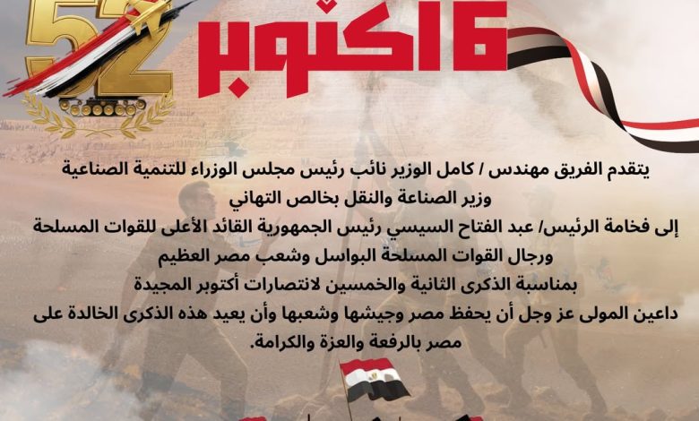 وقال الوزير، في البرقية التي نشرتها وزارة النقل: “يسعدني وكافة العاملين بوزارتي النقل والصناعة أن نتقدم لفخامتكم بأسمى آيات التهنئة؛ بمناسبة ذكرى انتصارات السادس من أكتوبر سنة 1973، ذلك اليوم الذي سطر فيه جيشنا العظيم ملحمة عظيمة ستظل مجدًا وفخرًا للأجيال القادمة”.