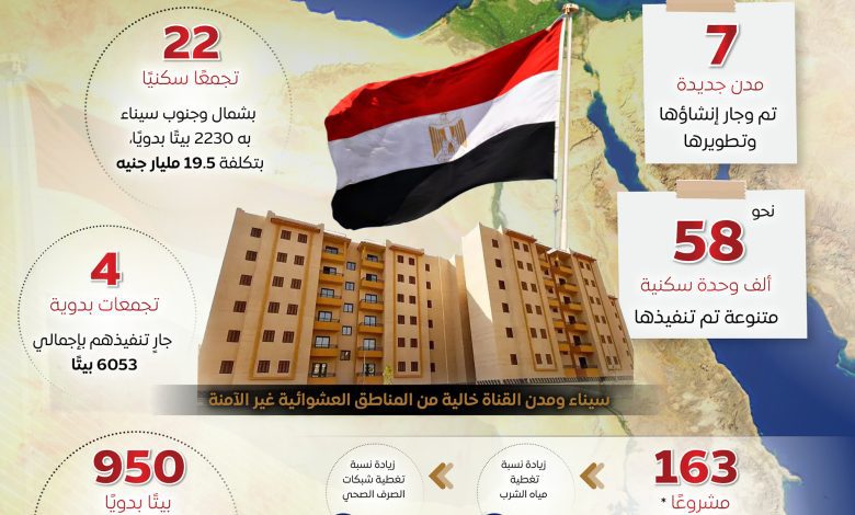 كما أبرزت الإنفوجرافات الجهود المبذولة في إنشاء التجمعات التنموية والبيوت البدوية، إذ تم إنشاء 22 تجمعًا سكنيًا بشمال وجنوب سيناء تضم 2230 بيتًا بدويًا، بتكلفة 19.5 مليار جنيه، ويجري إنشاء 950 بيتًا بدويًا إضافيًا ضمن المرحلة الثانية لامتداد 17 تجمعًا تنمويًا، فيما يجري تنفيذ ٤ تجمعات بدوية بإجمالي 6053 بيتًا.