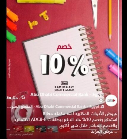 وقال البنك: عروض الأدوات المكتبية لسة مكملة معانا، استمتع بخصم 10% عند الدفع ببطاقات ADCB-E الائتمانية والخصم المباشر خلال شهر أكتوبر.