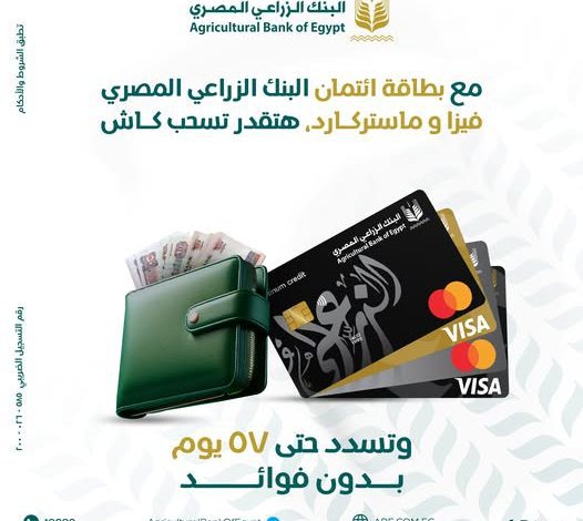 البنك الزراعي المصري يتيح السحب والشراء بدون فوائد حتى 57 يومًا عبر بطاقات فيزا وماستركارد
