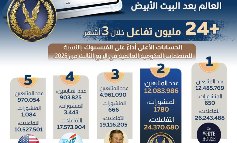 معلومات الوزراء: صفحة وزارة الداخلية في المركز الثاني عالميًا في أداء الحسابات الحكومية على “فيسبوك” خلال الربع الثالث من 2025