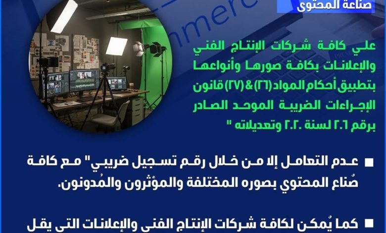 وأوضح الإنفوجراف أنه على كافة شركات الإنتاج الفني والإعلانات بكل صورها وأنواعها تطبيق أحكام المواد (26) و (27) قانون الإجراءات الضريبة الموحد الصادر برقم 206 لسنة 2020 وتعديلاته، “عدم التعامل إلا من خلال رقم تسجيل ضريبي” مع كل صناع المحتوى بصوره المختلفة والمؤثرون والمدونون.