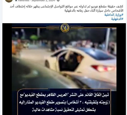 كشفت الأجهزة الأمنية بوزارة الداخلية حقيقة مقطع فيديو تم تداوله على إحدى الصفحات بمواقع التواصل الاجتماعي، يظهر خلاله اختطاف شخص أثناء حفل زفافه بالدقهلية.
