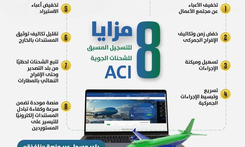 أصدرت وزارة المالية إنفوجراف توضح فيه مزايا نظام التسجيل المسبق للشحنات الجوية “ACI”، الذي سيتم تطبيقه إلزاميا في أول يناير المقبل من خلال المنصة القومية للتجارة المصرية عبر الحدود “نافذة”.