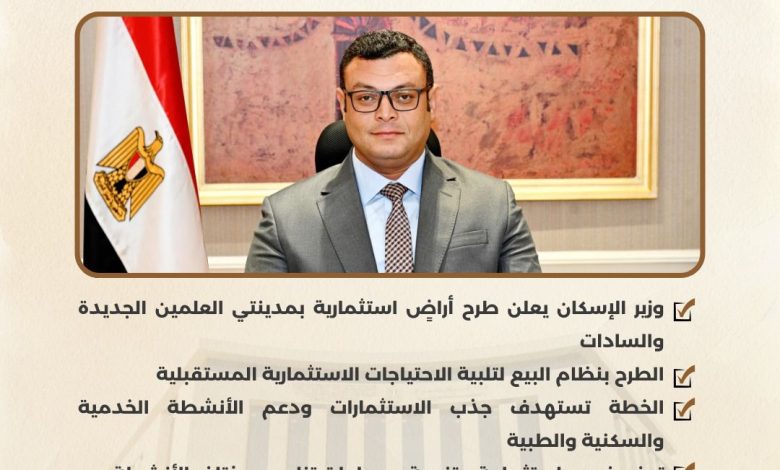أعلن المهندس شريف الشربيني، وزير الإسكان والمرافق والمجتمعات العمرانية، عن طرح مجموعة من قطع الأراضي الاستثمارية المميزة بمدينتي العلمين الجديدة والسادات بنظام البيع لتلبية الاحتياجات المستقبلية، والتي تأتي في إطار خطة هيئة المجتمعات العمرانية الجديدة للتوسع في جذب الاستثمارات المتنوعة ودعم الأنشطة الخدمية والسكنية والطبية بالمدن الجديدة.
