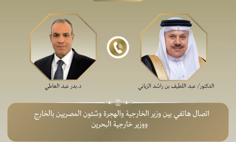 أكد الدكتور بدر عبد العاطي وزير الخارجية والهجرة وشئون المصريين بالخارج، والدكتور عبد اللطيف الزياني وزير خارجية مملكة البحرين خلال اتصال هاتفي اليوم السبت التطلع لمواصلة التنسيق والتشاور بما يسهم فى دعم الحلول السياسية والدبلوماسية للأزمات بالمنطقة وإحلال السلام والاستقرار.