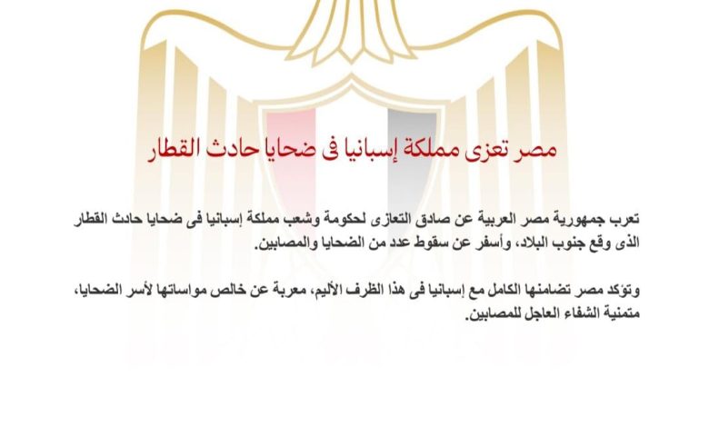 تعرب جمهورية مصر العربية عن صادق التعازى لحكومة وشعب مملكة إسبانيا فى ضحايا حادث القطار الذى وقع جنوب البلاد، وأسفر عن سقوط عدد من الضحايا والمصابين.