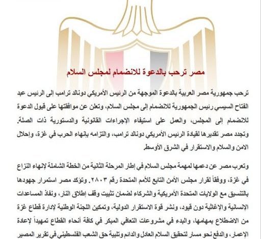 مصر ترحب بالدعوة للانضمام لمجلس السلام