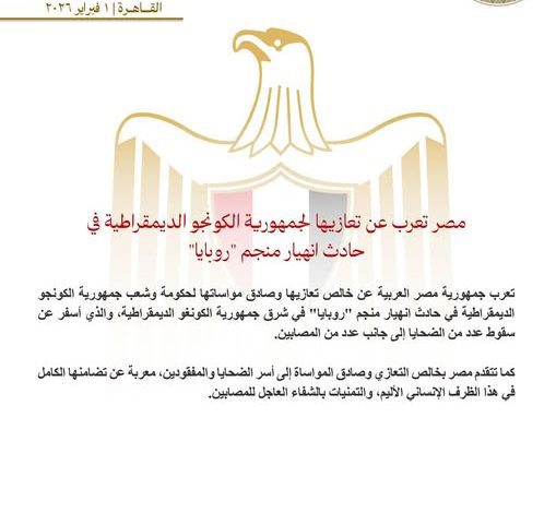 أعربت جمهورية مصر العربية عن خالص تعازيها وصادق مواساتها لحكومة وشعب جمهورية الكونغو الديمقراطية في حادث انهيار منجم “روبايا” في شرق جمهورية الكونغو الديمقراطية، والذي أسفر عن سقوط عدد من الضحايا إلى جانب عدد من المصابين.