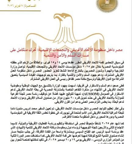 يأتي ذلك في سياق التحضير لقمة الاتحاد الإفريقي المقرر عقدها يومي 14 و15 فبراير الجاري، وانطلاقًا من الزخم الذي حققته الدبلوماسية المصرية خلال عام 2025 داخل مؤسسات الاتحاد الإفريقي والتجمعات الإقليمية.