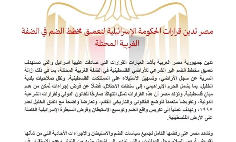مصر تدين قرارات الحكومة الإسرائيلية لتعميق مخطط الضم في الضفة الغربية المحتلة