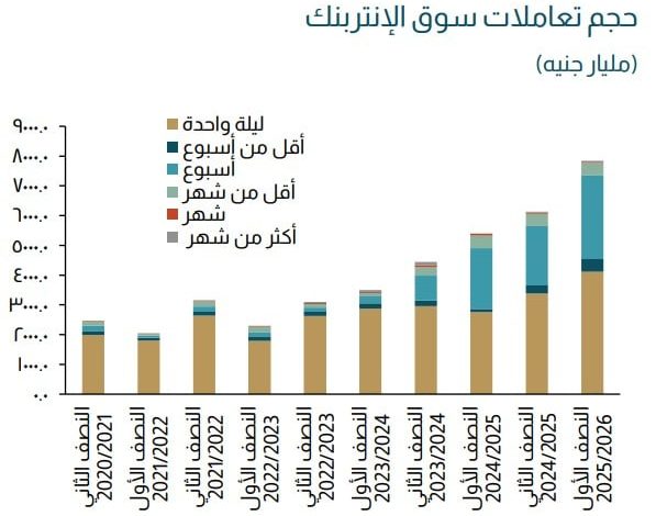 وقال البنك المركزي في تقرير السياسة النقدية الصادر عنه ، أن نشاط التداول يتركز في أجلي ليلة واحدة وأسبوع ، مما يعكس استمرار اعتماد البنوك على سوق الإنتربنك لإدارة السيولة قصيرة الأجل.