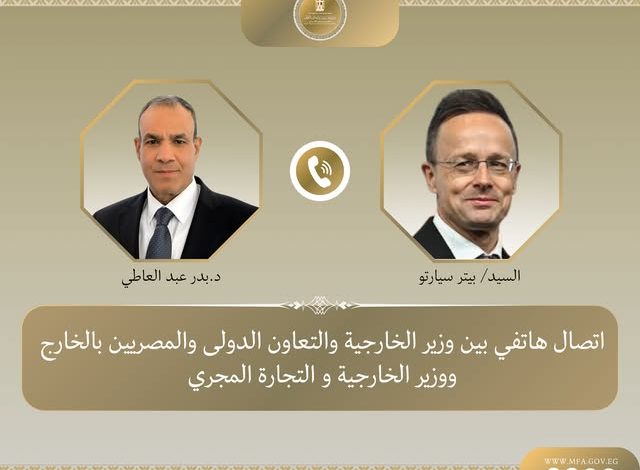 جرى اتصال هاتفي بين د. بدر عبد العاطي وزير الخارجية والتعاون الدولي وشؤون المصريين بالخارج، والسيد بيتر سيارتو وزير الخارجية والتجارة المجري، يوم الثلاثاء ٢٤ فبراير، وذلك لبحث سبل تعزيز العلاقات الثنائية بين البلدين وتبادل الرؤى إزاء عدد من القضايا الإقليمية والدولية ذات الاهتمام المشترك.