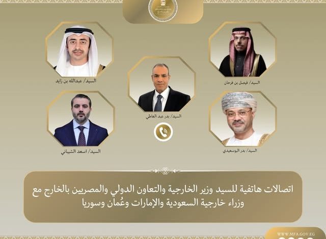 فى إطار متابعة التطورات المتلاحقة فى المنطقة، جرت سلسلة اتصالات هاتفية بين د. بدر عبد العاطي وزير الخارجية والتعاون الدولي والمصريين بالخارج، وكل من الأمير فيصل بن فرحان وزير خارجية المملكة العربية السعودية، وسمو الشيخ عبد الله بن زايد نائب رئيس مجلس الوزراء ووزير خارجية دولة الإمارات العربية المتحدة، والسيد بدر بن حمد البوسعيدي وزير خارجية سلطنة عمان، والسيد أسعد الشيباني وزير خارجية الجمهورية العربية السورية.