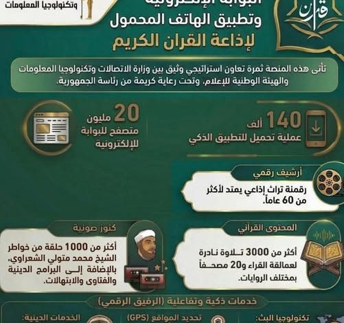 هذا وقد سخرت وزارة الاتصالات وتكنولوجيا المعلومات كافة إمكاناتها الفنية لإنشاء منصة رقمية متكاملة قادرة على استيعاب أرشيف يمتد لأكثر من 60 عاماً، وقد شملت جهود الوزارة في عملية الإنشاء برمجة تطبيق ذكي يتيح الوصول لأكثر من 3000 تلاوة نادرة لكبار القراء وأكثر من 20 مصحفاً كاملاً بمختلف الروايات والتعاون في تحويل الكنوز الصوتية، ومنها أكثر من 1000 حلقة لخواطر الشيخ الشعراوي فضلا عن مكتبة ثرية من البرامج الدينية والفتاوى والابتهالات.