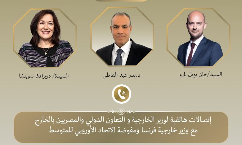 تلقى د. بدر عبد العاطي وزير الخارجية والتعاون الدولي والمصريين بالخارج اتصالاً هاتفيا من “جان نويل بارو” وزير خارجية فرنسا، كما تواصل مع “دوبرافكا سويتشا”، مفوضة الاتحاد الأوروبي للمتوسط، حيث تم تناول التطورات المتسارعة فى الاقليم والتصعيد العسكري الذي تشهده المنطقة، والجهود المبذولة لخفض التصعيد.