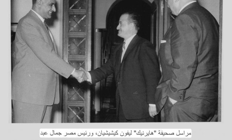 في لقطة أبيض وأسود تبدو بسيطة للوهلة الأولى، لكنها تحمل بين تفاصيلها عمقًا سياسيًا وإنسانيًا كبيرًا، يوثّق التاريخ واحدة من لحظات التواصل المباشر بين القيادة المصرية ودوائر التأثير الدولية. الصورة تجمع بين الرئيس المصري الراحل جمال عبد الناصر، ومراسل صحيفة New York Herald Tribune الصحفي ليفون كيشتيشيان، إلى جانب رجل الأعمال والمحسن الأمريكي من أصول أرمنية George Mardikian، وذلك خلال اجتماع عُقد في حي هليوبوليس بالقاهرة في يونيو عام 1958.