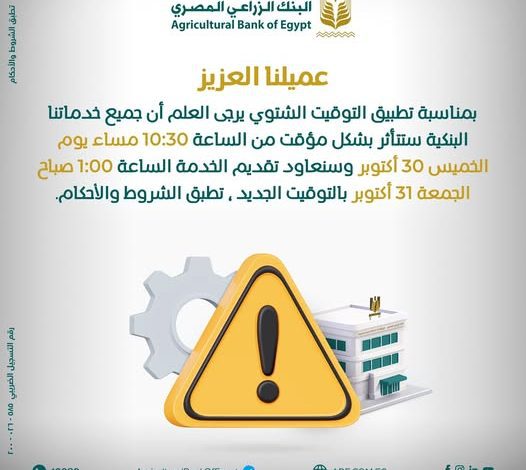 أعلن البنك الزراعي المصري أنه بمناسبة بدء العمل بالتوقيت الشتوي، سيتم إجراء بعض التحديثات على الأنظمة التشغيلية للبنك اليوم الخميس الموافق 30 أكتوبر 2025، وذلك اعتبارًا من الساعة 10:30 مساءً وحتى الساعة 1:00 صباح يوم الجمعة بالتوقيت الجديد.